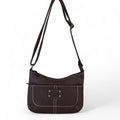 The COFFEE BROWN PU Leather Cotton Road Sling Bag with TAG is thoughtfully constructed with fine attention to detail. It includes a single adjustable shoulder strap and a main zippered compartment for convenient use. Additional storage is available through a centre front zip pocket and a back zip compartment, adding to its functionality.