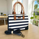 Crafted from durable navy blue and white striped PVC, this Cotton Road handbag delivers both style and practicality. The tan-trimmed design features dual handles for hand-carrying versatility, complemented by an adjustable shoulder strap for cross-body wear. Two zip compartments—one interior and one exterior—provide secure storage solutions for your essentials, making this piece an intelligent choice for everyday use.