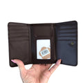 This grey PVC tri-fold wallet balances compact design with comprehensive organization. The rose motif embellishment adds visual appeal while the resilient material withstands daily use and moisture exposure. Internally, eight card slots accommodate your essentials, four dedicated note sections organize currency, and a transparent ID window enables quick verification. A utility clip secures loose items, and the zippered coin compartment ensures change stays contained and accessible. Designed for those who prioritize streamlined carry without sacrificing storage capacity.