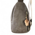 The KHAKI Cotton Road PU Leather Cross Body Bag / Mini Backpack features one adjustable shoulder strap, two zippered compartments, a front clip pocket, and a rear zippered section, providing efficient and organized storage for your belongings.