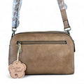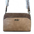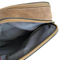 The KHAKI PU Leather Cotton Road Sling Bag includes an adjustable and removable shoulder strap, two zippered main compartments, a practical Front Clip Pocket, and an additional Back Zip Compartment for easy organization.