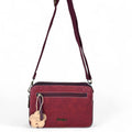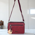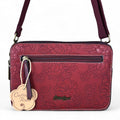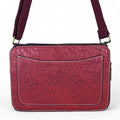 This MAROON RED PU Leather Cotton Road Sling Bag features embossed floral designs, a detachable and adjustable shoulder strap, two zippered compartments, and an additional back pocket for convenient storage.