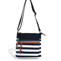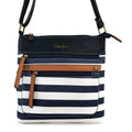 Crafted from durable PVC, this Cotton Road sling bag merges practical functionality with modern aesthetics. The striking navy and white striped pattern is elevated by sophisticated tan trim detailing, creating a versatile accessory suitable for various occasions. The adjustable shoulder strap ensures comfortable carrying, while the thoughtfully designed compartment system—featuring a spacious main section plus three strategically positioned zippered pockets—facilitates efficient organization. Whether navigating daily commutes or weekend outings, this bag delivers both style and purposeful storage solutions.
