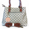 The Printed KHAKI PU Leather Cotton Road Handbag features a stylish design with tan trim and a durable Synthetic Leather construction. The handbag includes twin handles and a detachable, adjustable shoulder strap for added convenience, as well as multiple zip compartments for storage and organization.