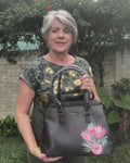 Expertly crafted, this BLACK PU Leather Cotton Road Handbag highlights detailed PROTEA embellishments. It includes two handles and a detachable, adjustable shoulder strap for versatile carrying options. The bag offers a main zip compartment with two internal sections, along with a front clip pocket and a rear zip compartment, ensuring spacious and well-organized storage.