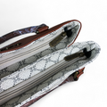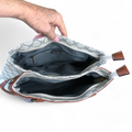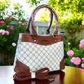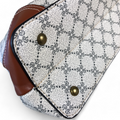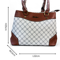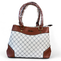 This handbag showcases a finely printed Ivory PU Leather Cotton Road pattern, complemented by an elegant Tan trim. It offers dual handles alongside a removable, adjustable shoulder strap, and includes two zippered compartments plus an additional zippered pocket at the back for organized storage.