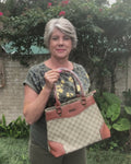 The Printed KHAKI PU Leather Cotton Road Handbag features a stylish design with tan trim and a durable Synthetic Leather construction. The handbag includes twin handles and a detachable, adjustable shoulder strap for added convenience, as well as multiple zip compartments for storage and organization.