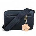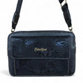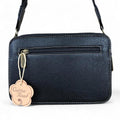 The BLACK PU Leather Cotton Road Sling Bag features an adjustable branded shoulder strap for a tailored fit. It includes two zippered compartments and a front pocket hidden beneath a floral clip flap, complemented by a rear zip pocket to enhance its functionality for everyday use.
