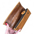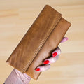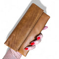 The Large CAMEL BROWN Tri-Fold VIVACE Genuine Leather Wallet with TOPSTITCH features a main clip compartment, 12 card slots, a clear ID/driver’s license window, four sections for notes, a zippered pocket, and an external back pocket, providing efficient and secure organization for your cards, cash, coins, and essential documents.