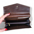The Large COFFEE BROWN Tri-Fold VIVACE Genuine Leather Wallet offers a main clip compartment, 10 card slots, four sections for notes, and a zippered pocket, providing reliable and organized storage for your cards, cash, coins, and essential documents.