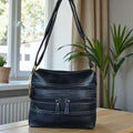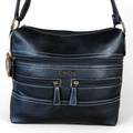 Crafted from durable PU leather, this sleek black sling bag combines functionality with refined aesthetics. The adjustable shoulder strap ensures personalized comfort for all-day wear, while the thoughtfully organized interior—featuring a main zip compartment, front zip pocket, dual zip pouches, and rear zip compartment—provides secure storage for essentials and valuables. An ideal companion for urban commutes and travel.