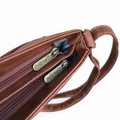 Carry essentials with refined functionality in this tan brown PU leather sling bag. Featuring an adjustable over-the-shoulder strap for comfortable all-day wear, the design includes a centre front zip compartment with clip closure and a rear zip compartment for organized storage. Premium strap detailing elevates the aesthetic while maintaining practical versatility for daily use.