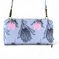 Crafted from durable PVC, this spacious blue cellphone sling wallet combines functionality with distinctive protea detailing. The removable over-the-shoulder strap offers versatile carrying options, while the front clip flap pocket provides quick access to essentials. Inside, discover a main zip compartment alongside a dedicated coin pocket with divider, two note slots, and 12 card slots—delivering comprehensive organization for daily carry. An expertly designed accessory that balances capacity with accessibility.