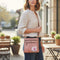 The PINK PU Leather Cotton Road Sling Bag with FLORAL detailing combines functionality and style, featuring three zippered compartments and an extra rear pocket for generous storage. Its adjustable shoulder strap provides ease and comfort for varied carrying preferences.