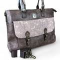 This sophisticated laptop bag combines practical design with refined aesthetics. The mauve PU leather exterior showcases an elegant lace print, while the twin handles and adjustable shoulder strap offer flexible carrying options. Inside, a main zip compartment keeps essentials secure, complemented by a front pocket beneath a clip flap for quick-access items. A dedicated rear zip compartment provides additional organization for documents or accessories. Engineered for professionals who demand both style and functionality.