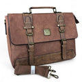 The BROWN PU Leather 15'6 Cotton Road Laptop Bag features a single handle and a detachable, adjustable over the shoulder strap for maximum convenience. It also includes a single zip compartment and a front pocket under the clip flap, as well as a back zip pocket.