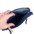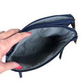 This BLUE PU Leather Sling Bag from Cotton Road features a BRANDED over-the-shoulder strap that is both detachable and adjustable for added comfort. It also includes two spacious zip compartments with a convenient center compartment and two additional front and back zip pockets for easy organization.