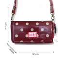 This spacious cellphone sling wallet combines practical functionality with vibrant style. Crafted from durable PVC material, it features a removable over-the-shoulder strap for versatile carrying options. The design includes a front clip flap pocket for quick access, a main zip compartment with an interior coin pouch and card divider, two note slots, and eight dedicated card holders. The bold red finish with dot detailing adds character while maintaining professional appeal. Ideal for those seeking organized, hands-free storage for daily essentials.