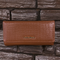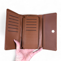 This Large TAN Tri-fold wallet is made of durable PU leather and features a stylish PATTERNED panel. It has an extensive design, including a clip compartment, 19 card slots, two ID/drivers license windows, five note pockets, and a practical coin zip compartment.
