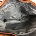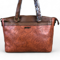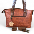 This TAN BROWN handbag is made of PU leather with a beautiful EMBOSSED FLOWERS design. It features twin handles and an adjustable over the shoulder strap, as well as a single zip compartment and front and back zip compartments for added storage.