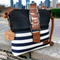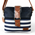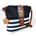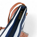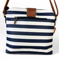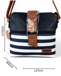The Cotton Road NAVY BLUE and WHITE PVC Sling Bag features a STRIPE and STRAP design, complete with an adjustable over-the-shoulder strap. It also includes a single zip compartment, as well as front and back zip compartments for added storage and organization.