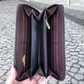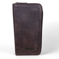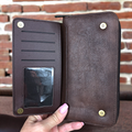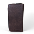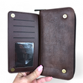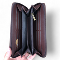 This PU leather wallet, available in a large size, features a sophisticated brown color. It includes a clip compartment, 3 card slots, 1 ID/license window, 1 note pocket, and 1 zip compartment with 12 card slots, as well as a divider and zip coin pouch.