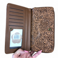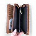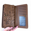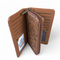 Experience luxury and functionality with the Large CAMEL BROWN PU Leather Cotton Road Wallet featuring an elegant EMBOSSED Pattern. This wallet boasts 10 Card Slots, 2 ID/Drivers License Windows, and 4 Note Pockets divided into Two Clip Compartments, all while providing a Zip Compartment for secure organization of currency and coins.