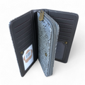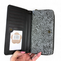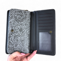 The Cotton Road Large GREY PU Leather Cotton Road Wallet boasts elegant EMBOSSED Pattern detailing and a spacious design with 10 Card Slots and 2 ID/Drivers License Windows. It also features 4 Note Pockets in Two Clip Compartments and a secure Zip Compartment for organizing notes and coins.