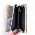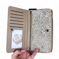 The Large KHAKI PU Leather Cotton Road Wallet boasts a refined design featuring an EMBOSSED Pattern and ample space for storage. It boasts 10 Card Slots, 2 ID/Drivers License Windows, and 4 Note Pockets divided into Two Clip Compartments, along with a Zip Compartment for organizing currency and coins.