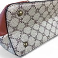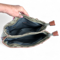 The Printed KHAKI PU Leather Cotton Road Handbag features a stylish design with tan trim and a durable Synthetic Leather construction. The handbag includes twin handles and a detachable, adjustable shoulder strap for added convenience, as well as multiple zip compartments for storage and organization.